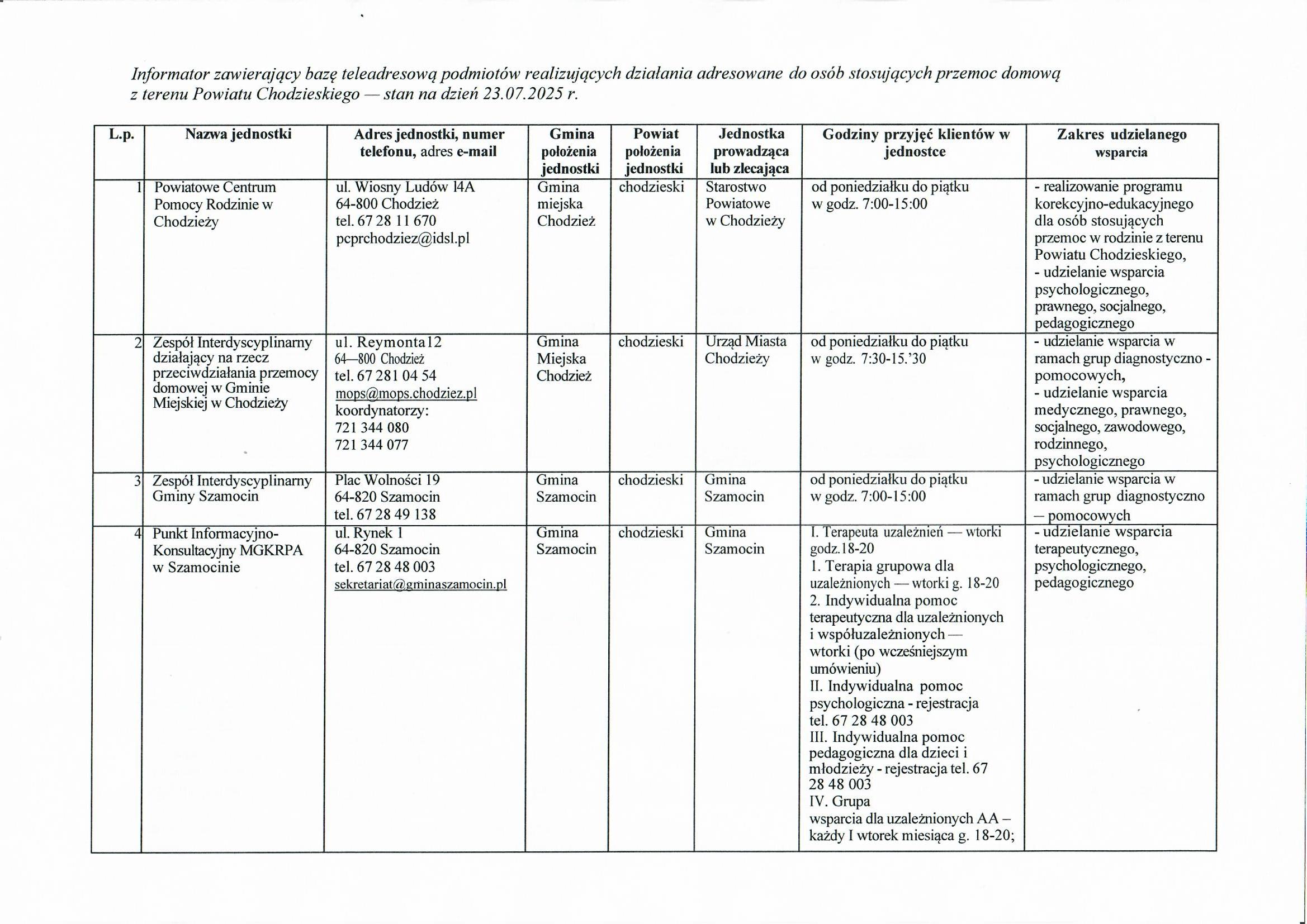 Problem występowania przemocy można również zgłosić pracownikowi socjalnemu, dzielnicowemu, lekarzowi 1-wszego kontaktu przedstawicielowi oświaty bądź Gminnej Komisji Rozwiązywania Problemów Alkoholowych.